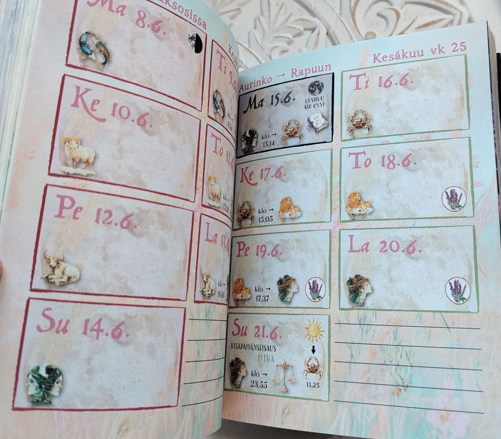 Lisätietoja: Tämä kalenteri on päivyri/pöytäkalenteri. Mahtuu sopivasti myös laukkuun (koko 20 cm x 16). Kalenteri on pehmeäkantinen ja lankasidottu. Ei kierteellä (tasainen selkä). Yhdellä sivulla on aina kaikki viikonpäivät, niihin on merkitty kuun astrologinen merkki ja kuinka se vaihtaa merkkiä. Laatikossa on tilaa sen päivän merkinnöille. Kalenterin alussa on lisätietoja kehon herkkyysalueista eri kuumerkeissä, värähtelystä, astrologiasta, maadoittumisesta, kasvien viljelystä kuun mukaan ym. Runsas tietopaketti.